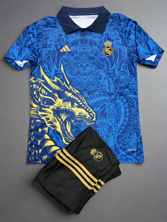 Real Madrid Blue and Gold Special Dragon Edition Jersey with Shorts
