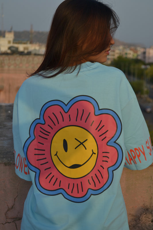 Happy Sunflower Oversized 100% Cotton Sky Blue Printed Unisex T-Shirt