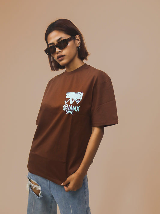 Genanx Swag Young At Heart Oversized 100% Cotton Coffee Brown Printed Unisex T-Shirt