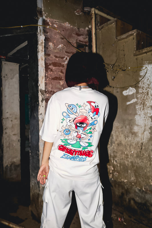 Greetings Earthings Oversized 100% Cotton Pearl White Printed Unisex T-Shirt