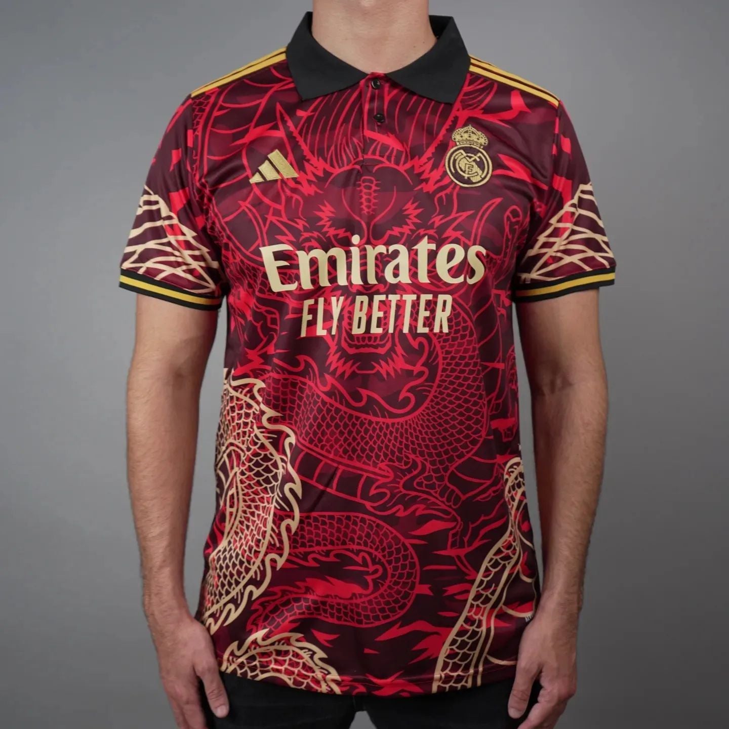 Upgrade your game with the Real Madrid Red Dragon Jersey and Shorts set. Made with high-quality materials, this set features the iconic red dragon design, representing the fierce spirit of the team. Slip into this set and feel confident and unstoppable on the field.